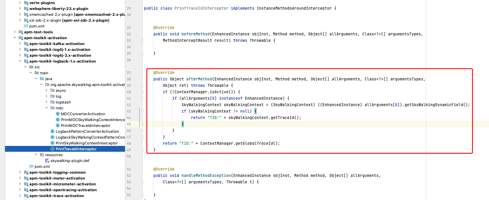这样 logback 在具体执行 convert 方法进行 tid 的转换时,由于 Agent 已经动态创建了切面插桩,此处就能获取到真实的上下文链路的 TraceId 了。