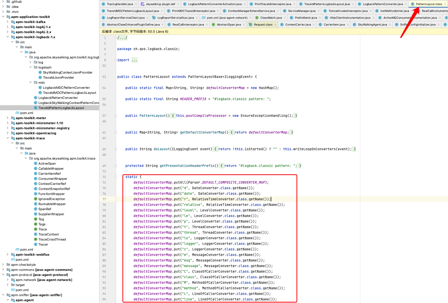 此处定义了针对不同的 key,对应的转换类信息,以上可以看到,针对 tid 则对应的转换类是:LogbackPatternConverter.class.getName()
