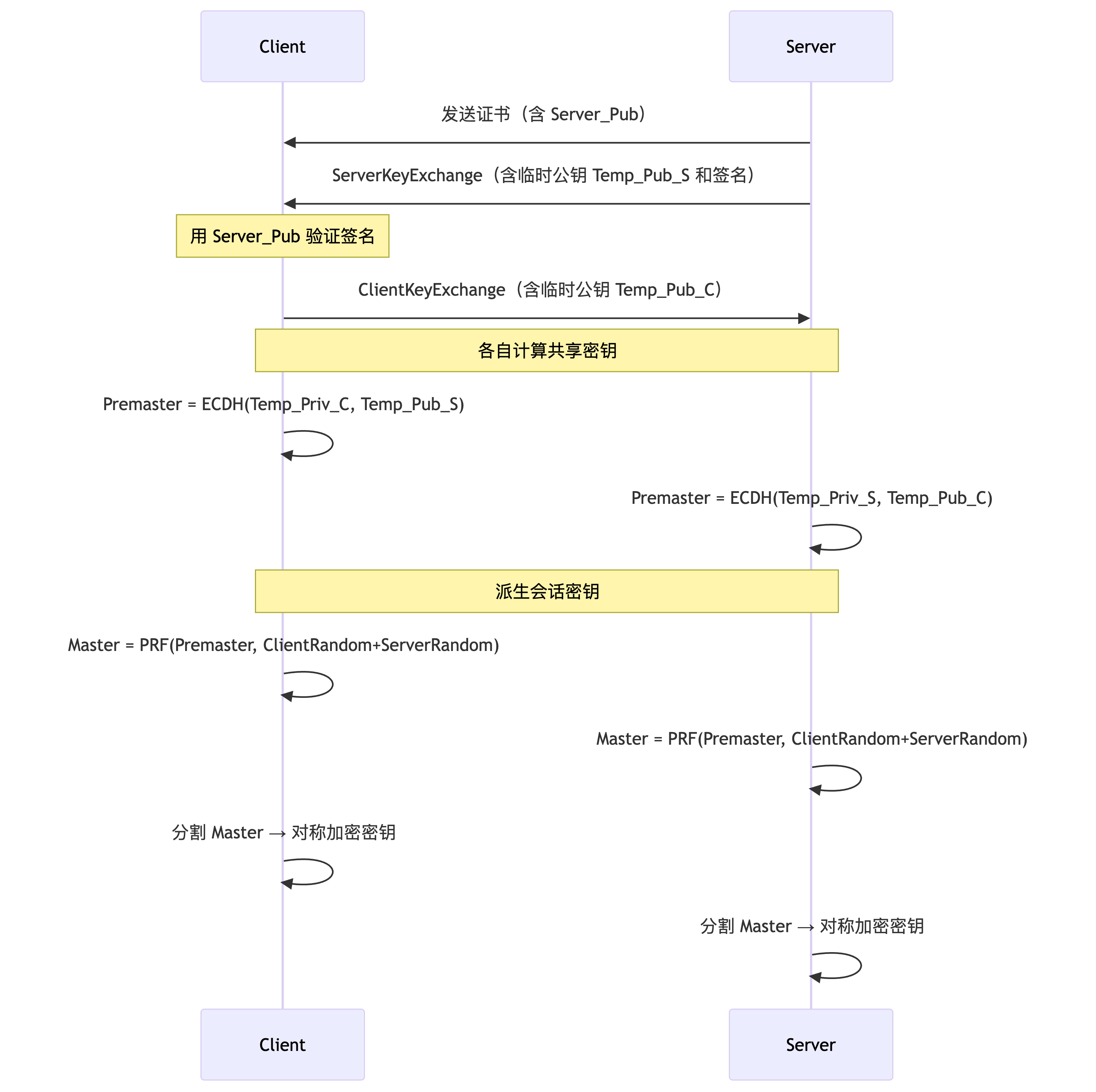 此时通过 ECDH,使用自己的临时私钥和对方的临时公钥 ,可以生成一个相同的密钥 Key,该密钥 Key 就是后续会话进行加密使用的会话密钥。